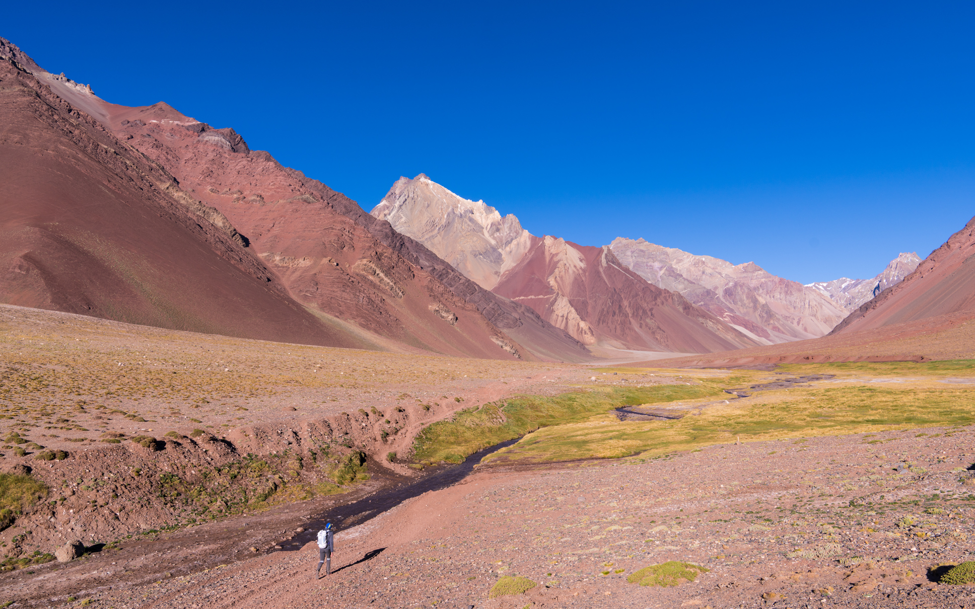 I went with my friend Christoph, and on 10 December we flew into Santiago, Chile. On the 12th, we got dropped off at the ranger station at the park entrance and were sent on our way. The first thing that struck me was the colors of the mountains. Blue sky, red sand, gray stone, green grass, and white-capped summits.